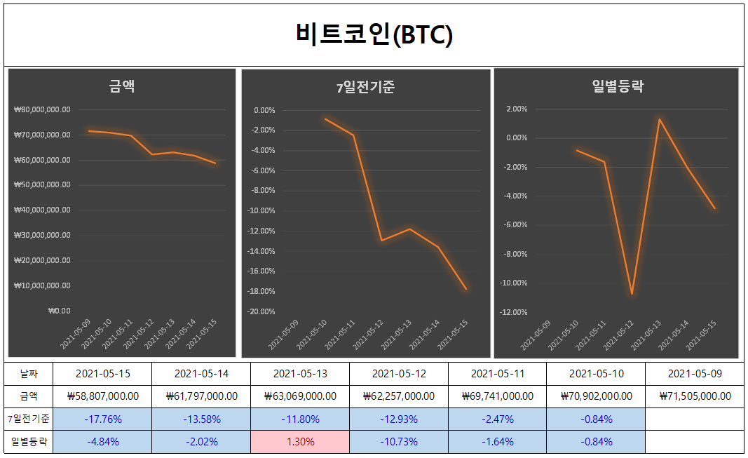 5월 13일날 잠깐 상승하였지만 다시 하락하며 15일날에 6천만원대가 깨졌습니다