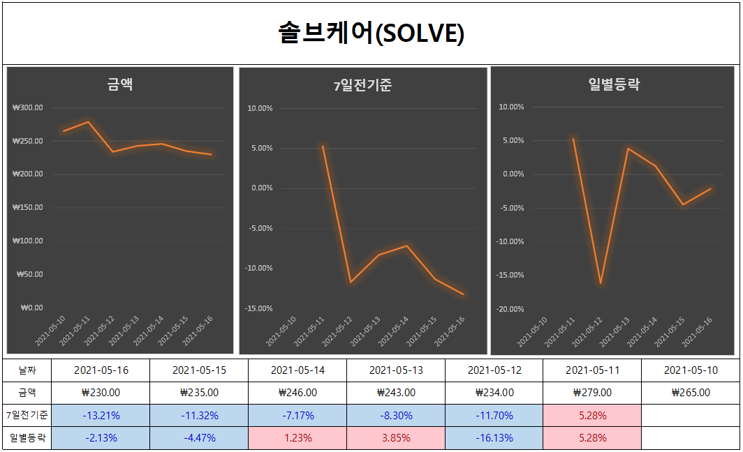 전일기준 하여 7일전 비교해보면 -13.21%를 기록하고 있습니다